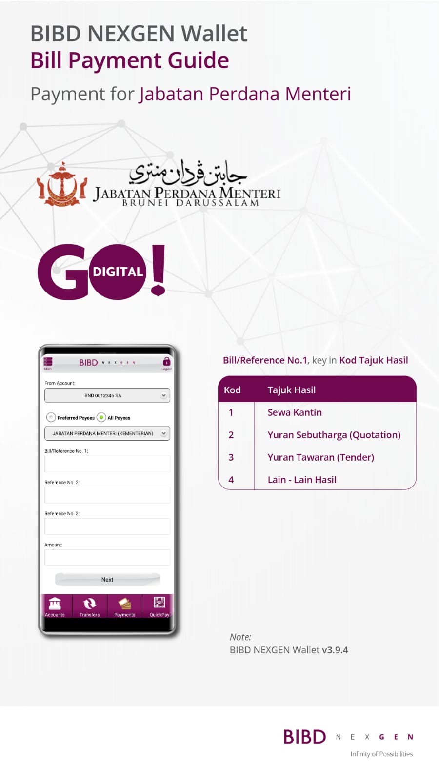 Please take close attention to the “If interested, please contact/collect” column on how to collect the quotation/tender requested. All fees (if any) are to be paid Online via BIBD :